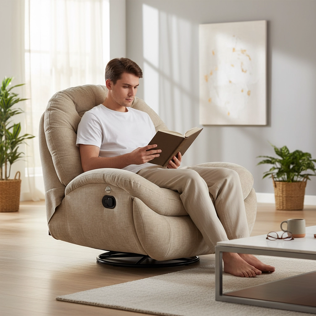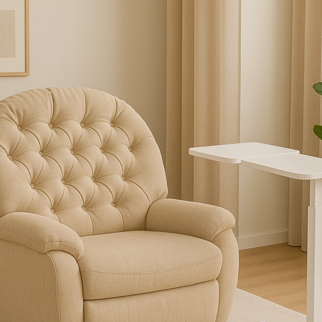 Domowa oaza komfortu: fotel Flax 04M (beżowy) z potrójnym systemem relaksu — manualna regulacja oparcia i podnóżka, kołyska (Glider) oraz obrót 360° (Swivel) — oraz stolik BUDDY 15-GWW (biały) z dwoma blatami i płynną regulacją wysokości. Wygoda do czytania, pracy i odpoczynku zawsze pod ręką.