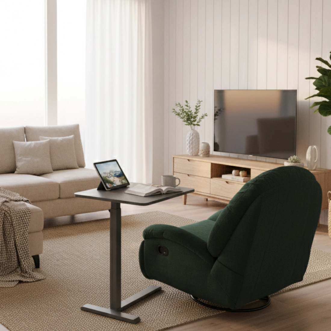 Twój kącik relaksu i pracy: fotel Spacetronik Flax 04M z potrójnym systemem relaksu (glider, swivel 360°, manualna regulacja oparcia i podnóżka) oraz mobilny stolik BUDDY 15-GBB z dwoma blatami i płynną regulacją wysokości. Miękkość, ergonomia i organizacja — wszystko pod ręką.